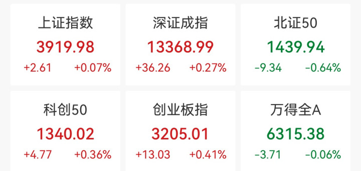 中新经纬12月23日电23日,A股三大指数小幅上涨。截至收盘,上证指数涨0.07%,报3919.98点;深证成指涨0.27%,报13368.99点;创业板指涨0.41%,报3205.01点。