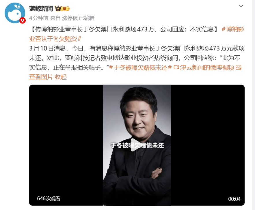 根据蓝鲸新闻,随后针对于冬被曝欠赌债未还,记者致电博纳影业投资者热线询问,对方回应称:“此为不实信息,正在举报相关帖子。”